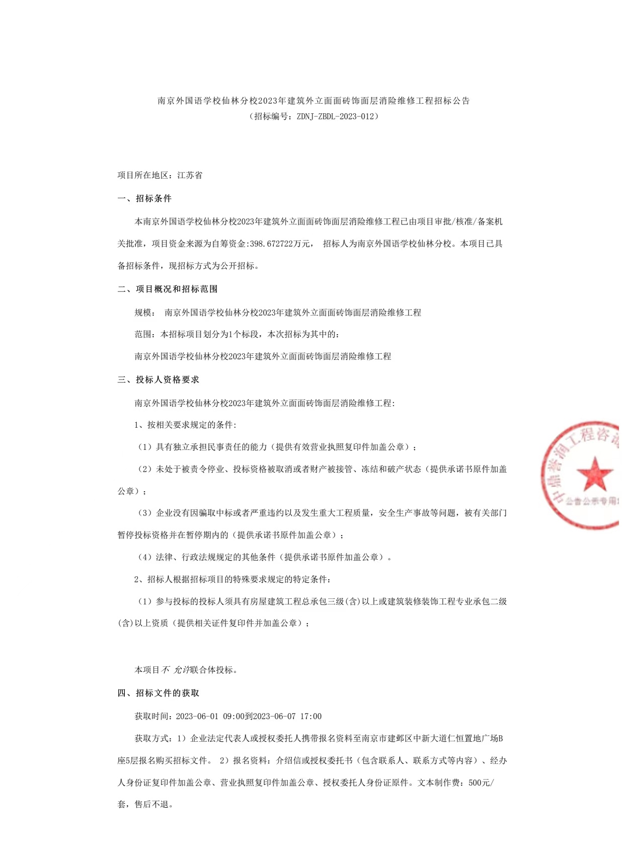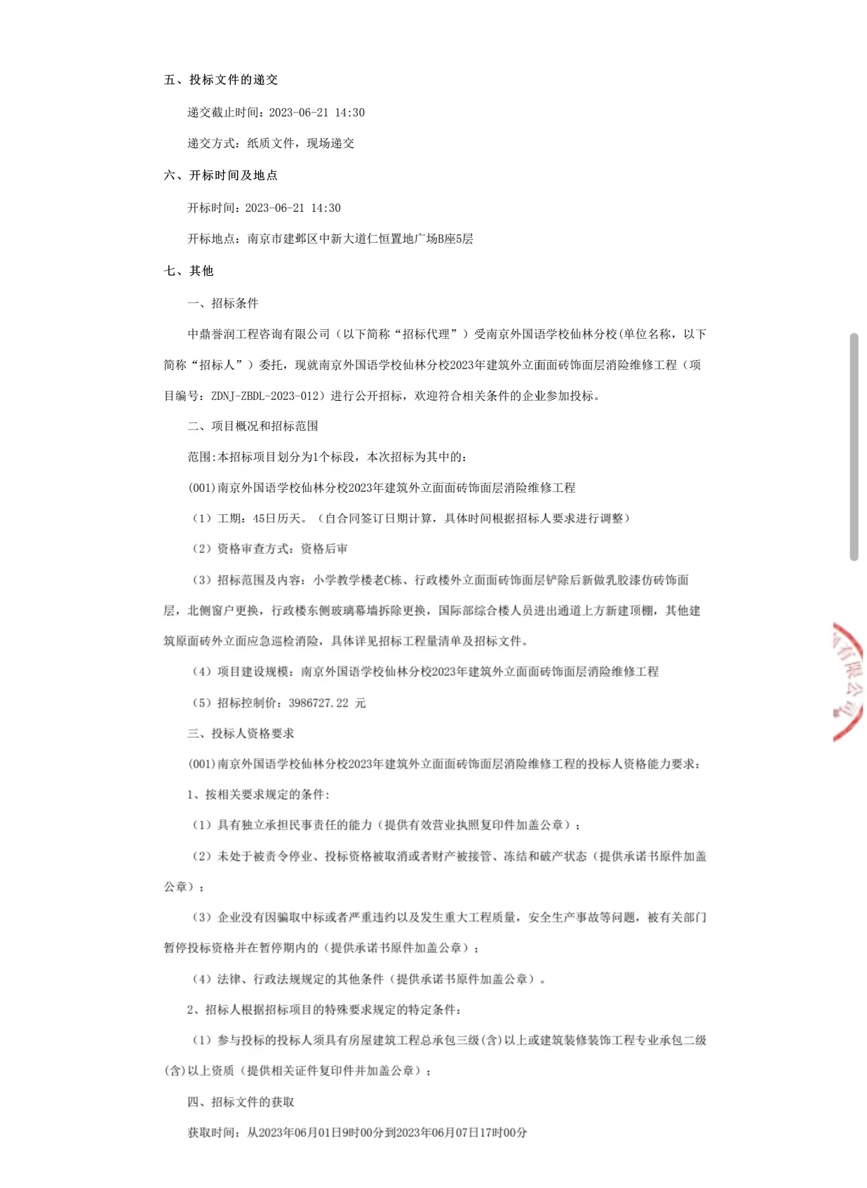南京外國(guó)語(yǔ)學(xué)校仙林分校2023年建筑外立面面磚飾面層消險(xiǎn)維修工程招標(biāo)公告