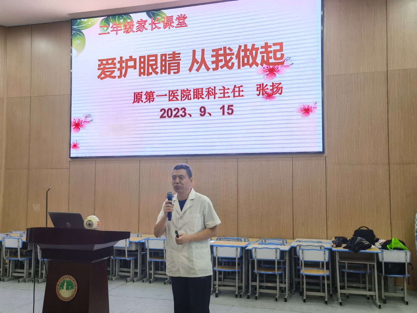 2023年9月15日下午,二年級組很榮幸的邀請到了原第一醫(yī)院眼科主任張揚(yáng)教授來校講座,張教授給二年級學(xué)生帶來了一場別開生面的護(hù)眼小課堂,張教授用通俗的兒童化語言從眼睛的結(jié)構(gòu)開始講起,再到近視形成的原因,近視的癥狀,再到近視的危害,多角度進(jìn)行了分析,并在現(xiàn)場和同學(xué)們進(jìn)行了親切的互動,最后提醒所有學(xué)生每天需堅持戶外鍛煉,注意端正坐姿,有效保護(hù)好我們的雙眼。