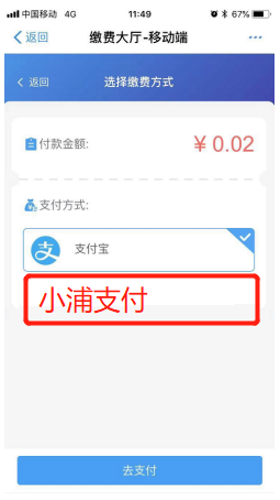 4、選擇“支付方式”,支付寶、小浦支付,點擊圖1-4中的“去支付”,進入支付頁面,如圖1-5,點擊“立即付款”即可完成支付,如圖1-6。注意:如果提示付款金額超限額,請先把錢轉(zhuǎn)入支付寶余額里,再進行繳費。