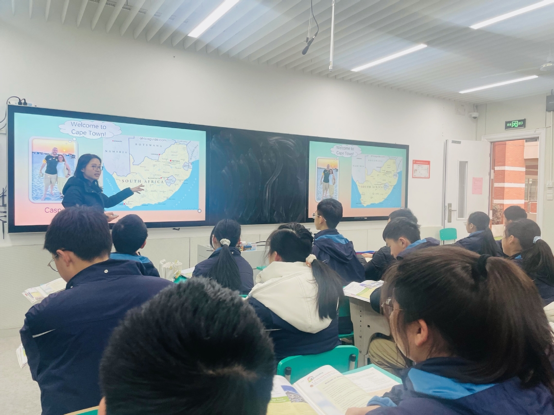 本次活動(dòng)本著“主題意義背景下的初中拓展教學(xué)研究”為導(dǎo)向,把我校的特色英語教材EIM教學(xué)面向全區(qū)進(jìn)行了展示與匯報(bào)。首先,由王玨老師執(zhí)導(dǎo)了一節(jié)EIM第一冊Unit 8的閱讀課,王玨老師設(shè)計(jì)巧妙,先從我校南非籍外教老師Casper及家人的照片為切入口,不僅抓住了學(xué)生們的興趣還拉近了師生間的關(guān)系,開門見山式地導(dǎo)入,直接把學(xué)生們帶進(jìn)了關(guān)于南非這一旅游勝地的閱讀課。接下來王玨老師以教學(xué)目標(biāo)為引領(lǐng),創(chuàng)設(shè)情境,教學(xué)環(huán)節(jié)層層遞進(jìn),使得這節(jié)課聽下來的感覺就像是大姐姐帶領(lǐng)著一群小伙伴去南非探索,去發(fā)現(xiàn)一個(gè)新大陸一樣,學(xué)生們?nèi)袒?dòng),充滿了激情和好奇。在小組討論過程中,王玨老師走到學(xué)生中去,和學(xué)生親切地交流探討,整節(jié)課令所有在場的聽課老師和學(xué)生們?nèi)玢宕猴L(fēng)。