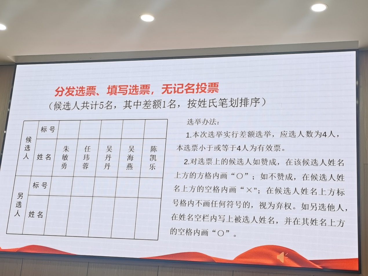 大會嚴(yán)格按照公平、公正、公開的要求,經(jīng)過差額選舉,采取無記名投票方式,選舉產(chǎn)生了新一屆黨支部班子成員。吳丹丹同志、朱敏勇同志、吳海燕同志、陳凱樂同志當(dāng)選。