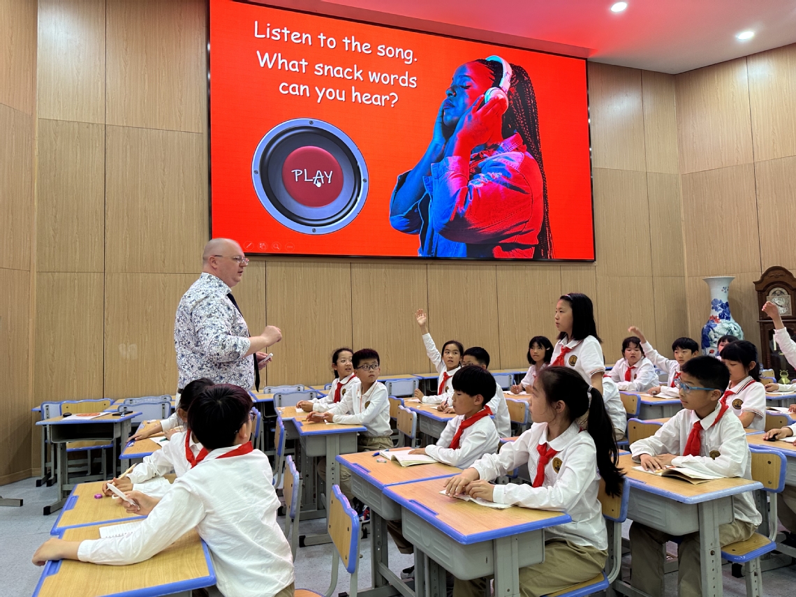 中學部的幾位外教的課程內(nèi)容主要關注中西方校園生活的對比;電影書籍等學生熟悉的課后娛樂內(nèi)容以及社會問題等話題。課程的設計很符合中學生的學習特點,鍛煉學生的比較分析能力和使用英語闡述論點的能力。而小學外教則圍繞各學齡段感興趣的話題開展課堂活動,如:旅游、食物、動物等,課堂上教學手法多樣且有趣,不論是把教學內(nèi)容融入歌詞還是組織學生們在游戲中學習,每一個環(huán)節(jié)都體現(xiàn)了外教們的巧思。