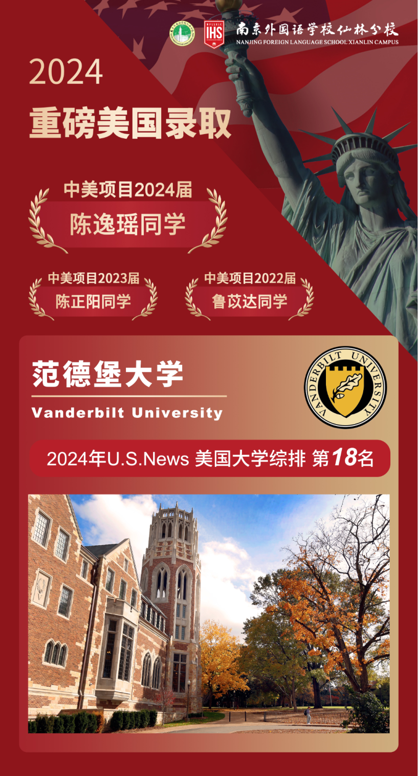在全球化的教育背景下,南外仙林分校國際高中(以下簡稱“仙外國高”)以其獨特的教學模式和培養(yǎng)目標,成為了連接中國學生與世界頂尖大學的橋梁。它不僅承載著學生的夢想,更以實實在在的成果證明了自己的價值。自2022屆魯苡達同學首次叩開范德堡大學大門后,2023屆陳正陽同學,本屆的陳逸瑤同學,連續(xù)三年均有學生成功錄取到美國著名的范德堡大學,這一成就不僅是對學生個人努力的肯定,也是對仙外國高辦學質(zhì)量的最大肯定。