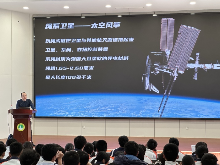 江老師以“風箏”話題引入“太空風箏”這一概念,并對“繩系衛(wèi)星”的定義加以形象的解釋,講座主要介紹了太空風箏的特點、發(fā)展現(xiàn)狀、功能及未來發(fā)展,旨在為學生們深入淺出地介紹繩系衛(wèi)星的相關(guān)知識,培養(yǎng)科技強國的責任感與自豪感。