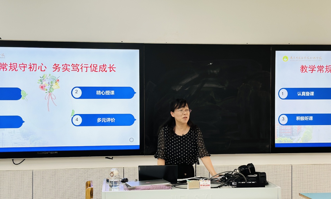隨后薛梅主任以“教學(xué)常規(guī)守初心,務(wù)實篤行促成長”為主題,向全體英語教師提出了新學(xué)年的要求和期望。外語部本學(xué)年將要求英語教師重點做好認真?zhèn)湔n、精心授課、積極聽課同時加大教學(xué)評價的改革力度,深入落實多元化評價的機制。薛老師強調(diào)在英語教學(xué)新課標的要求下,我們的教學(xué)也應(yīng)該“以人為本”,關(guān)注學(xué)生的個體差異性,探索分層教學(xué)。同時全體英語教師應(yīng)該研學(xué)秉承英語學(xué)習(xí)活動觀,引導(dǎo)學(xué)生樂學(xué)善學(xué)。這也要求我們在備課的過程中更加靈活深入,善用資源,與時俱進。
