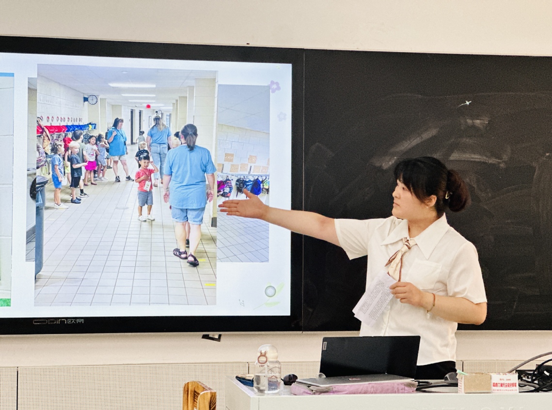 會議開始龔熙華主任介紹了會議的主要流程。首先由中學(xué)部于碧若老師和孫靜老師作為代表向各位同仁匯報了暑期前往美國威斯康星大學(xué)進行為期兩周的教師培訓(xùn)的感悟和收獲。于碧若老師從美國價值觀的多樣性入手,介紹了美國教育的基本情況,其中包括美國的課程設(shè)置和美國師生的生活方式等方面。孫靜老師則是介紹了一些培訓(xùn)中的具體課堂活動的操作過程。在這次的培訓(xùn)中,18位來自各個學(xué)部的英語老師自己又做回學(xué)生,有了更加深入的體驗。在今后的教學(xué)中我們也希望能夠運用所學(xué)的知識和技能,為我們的學(xué)生拓展英語學(xué)習(xí)的廣度和深度,使他們有能力用英語向世界傳遞中國文化。