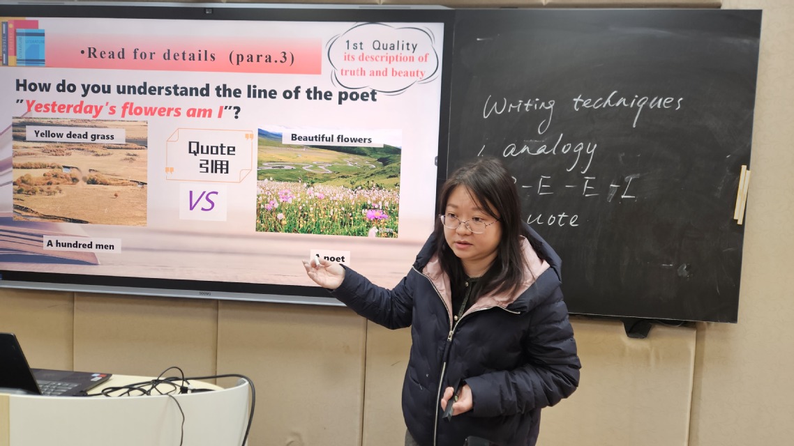 在細(xì)節(jié)閱讀和深度解析環(huán)節(jié),蘇老師引導(dǎo)學(xué)生深入剖析文本內(nèi)容,理解文學(xué)作品中的深層含義和作者的寫作意圖。通過提問、討論和類比等方式,幫助學(xué)生逐步揭開文學(xué)作品的神秘面紗,發(fā)現(xiàn)其中的真理和美。比如通過貝殼聽到微弱的聲音來類比文學(xué)作品中的真理和美,以及通過詩人的例子來證明有些真理和美需要敏感的靈魂去發(fā)現(xiàn),都極大地增強了課堂的生動性和說服力。同時,蘇老師還鼓勵學(xué)生進行拓展延伸,將課堂所學(xué)與自己的生活經(jīng)驗相結(jié)合,形成自己獨特的見解和感悟。