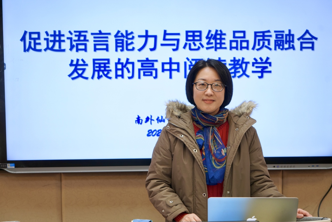 隨后,趙麗老師就“如何在高中英語閱讀教學(xué)中促進(jìn)語言能力與思維品質(zhì)的融合發(fā)展”開設(shè)了精彩的講座。她提出,教師應(yīng)該設(shè)計(jì)富有挑戰(zhàn)性的閱讀任務(wù),鼓勵(lì)學(xué)生主動(dòng)探索和表達(dá)自己的觀點(diǎn),以此來鍛煉他們的邏輯思維和創(chuàng)新能力。
