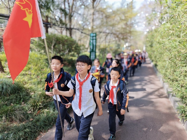 踏著和煦的春光我們從下馬坊啟程。人行步道在林中蜿蜒,斑駁樹影里掠過金陵郵局的朱紅門楣,地震臺的圍墻見證著時光沉淀。水榭的清波映出孩子相互扶持的身影,汗水浸潤的校服綻放著青春的溫度。