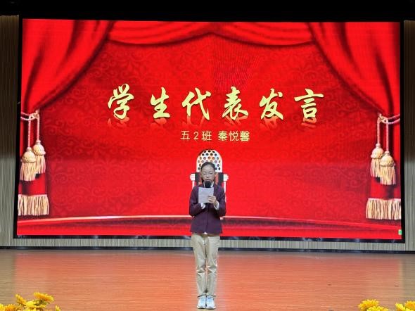學(xué)生代表五2班秦悅馨同學(xué)上臺發(fā)言。她分享了自己是如何開啟的學(xué)習(xí)密碼,并強調(diào)了勤奮學(xué)習(xí)、習(xí)慣養(yǎng)成的重要性。同時,她還表示會繼續(xù)努力,感謝老師們的支持與指導(dǎo)。