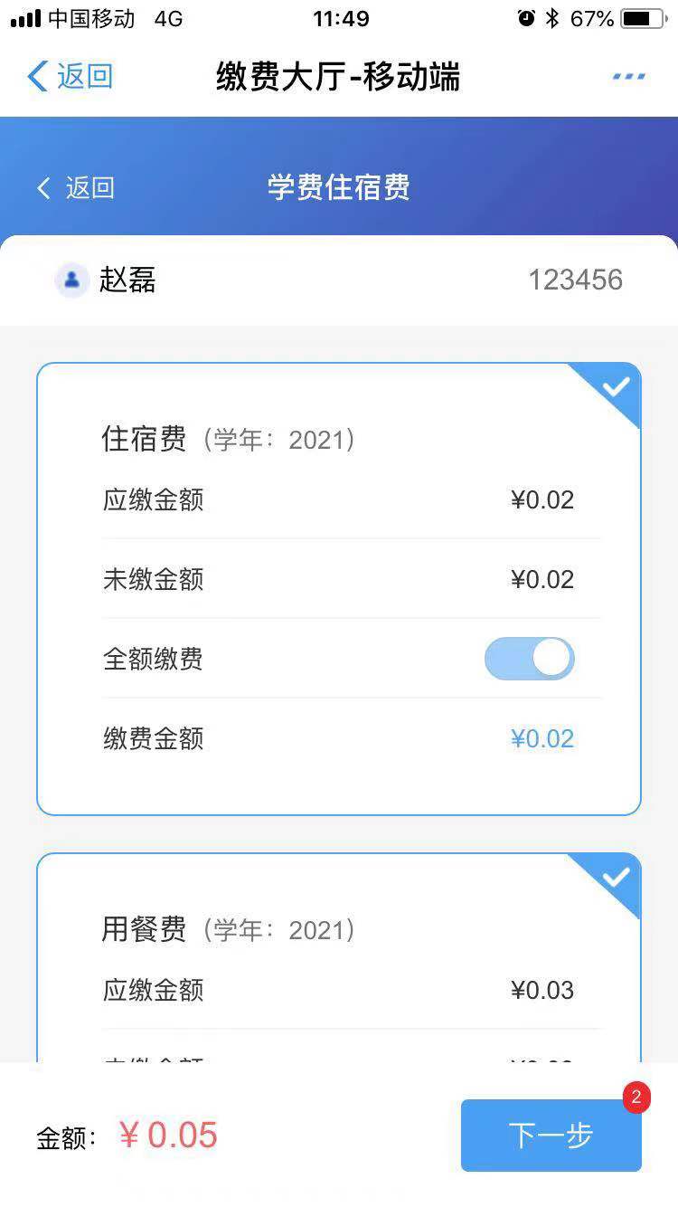 3、點(diǎn)擊圖1-2中的“學(xué)宿費(fèi)”進(jìn)入學(xué)宿費(fèi)項(xiàng)目繳費(fèi)頁(yè)面,查看學(xué)生姓名,繳費(fèi)明細(xì),如圖1-3,點(diǎn)擊圖1-3中的“下一步”按鈕,跳轉(zhuǎn)到繳費(fèi)方式選擇頁(yè)面如圖1-4。