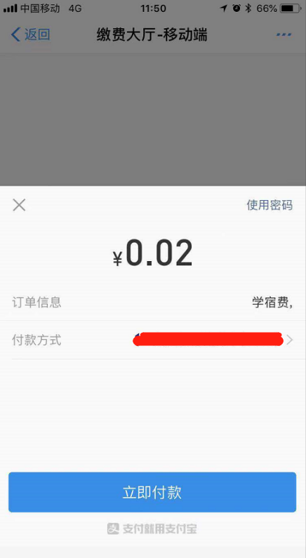 4、選擇“支付方式”,支付寶、小浦支付,點(diǎn)擊圖1-4中的“去支付”,進(jìn)入支付頁(yè)面,如圖1-5,點(diǎn)擊“立即付款”即可完成支付,如圖1-6。注意:如果提示付款金額超限額,請(qǐng)先把錢轉(zhuǎn)入支付寶余額里,再進(jìn)行繳費(fèi)。