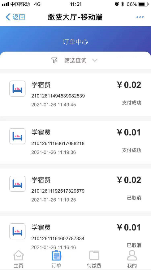 5、繳費(fèi)完成后可以在主頁(yè)如圖1-7中點(diǎn)擊“訂單”按鈕,查詢繳費(fèi)訂單如圖1-8