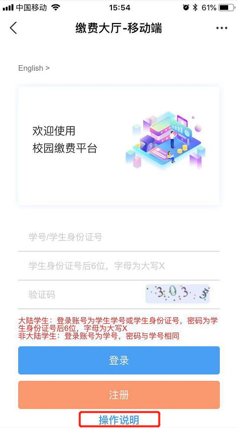 2、掃碼后手機(jī)上顯示的頁(yè)面如圖1-1,點(diǎn)擊“操作說明”可以查看繳費(fèi)操作指南輸入用戶名:(用戶名為學(xué)生的身份證號(hào)或?qū)W號(hào))、密碼:(密碼為學(xué)生的身份證號(hào)碼后6位,如有字母,字母為大寫),非大陸學(xué)生用學(xué)號(hào)登錄,密碼與學(xué)號(hào)相同。點(diǎn)擊“登錄”按鈕進(jìn)入系統(tǒng),如圖1-2。