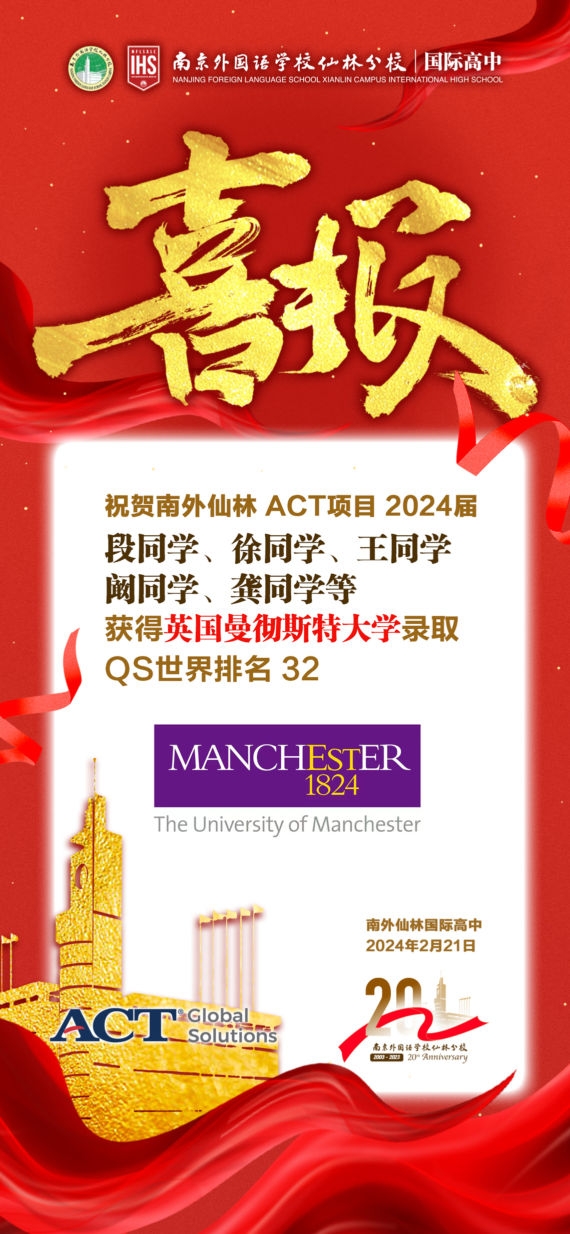 offer季 || 祝賀2024屆ACT項(xiàng)目5位同學(xué)獲得英國(guó)曼徹斯特大學(xué)錄??!