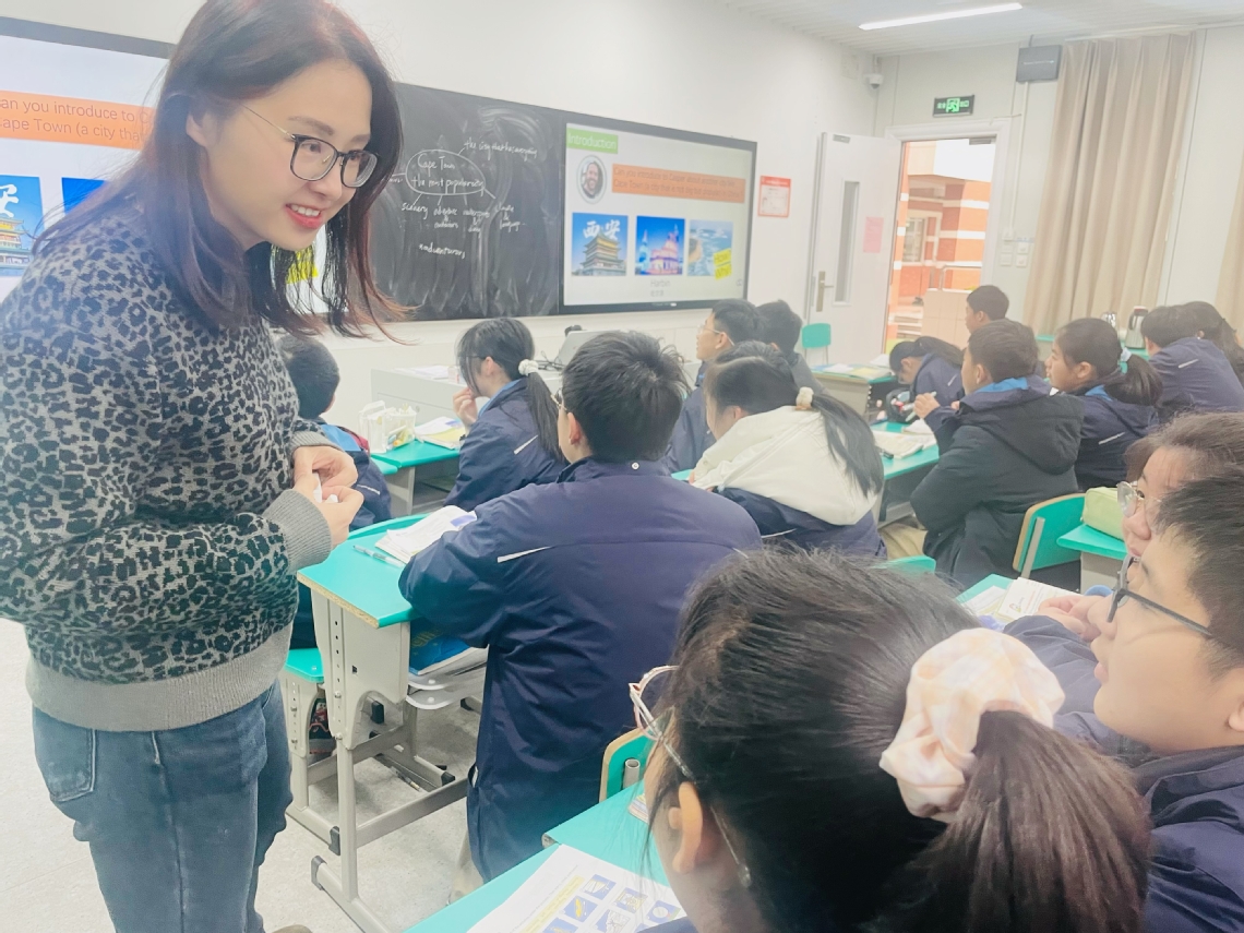本次活動本著“主題意義背景下的初中拓展教學(xué)研究”為導(dǎo)向,把我校的特色英語教材EIM教學(xué)面向全區(qū)進行了展示與匯報。首先,由王玨老師執(zhí)導(dǎo)了一節(jié)EIM第一冊Unit 8的閱讀課,王玨老師設(shè)計巧妙,先從我校南非籍外教老師Casper及家人的照片為切入口,不僅抓住了學(xué)生們的興趣還拉近了師生間的關(guān)系,開門見山式地導(dǎo)入,直接把學(xué)生們帶進了關(guān)于南非這一旅游勝地的閱讀課。接下來王玨老師以教學(xué)目標(biāo)為引領(lǐng),創(chuàng)設(shè)情境,教學(xué)環(huán)節(jié)層層遞進,使得這節(jié)課聽下來的感覺就像是大姐姐帶領(lǐng)著一群小伙伴去南非探索,去發(fā)現(xiàn)一個新大陸一樣,學(xué)生們?nèi)袒樱錆M了激情和好奇。在小組討論過程中,王玨老師走到學(xué)生中去,和學(xué)生親切地交流探討,整節(jié)課令所有在場的聽課老師和學(xué)生們?nèi)玢宕猴L(fēng)。