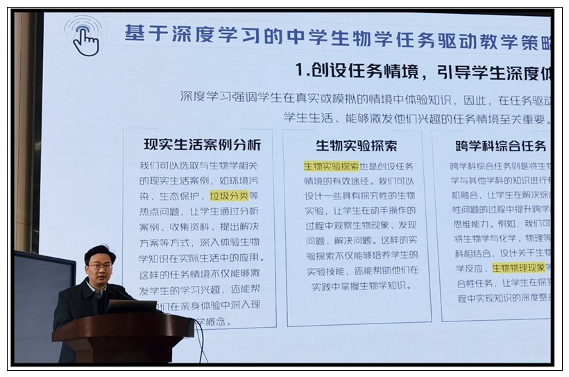 最后,徐廣宇主任做了主題為“基于深度學習的中學生物學任務驅動教學探索”的講座。徐主任指出深度學習不僅能夠促進學生對知識的深層次理解和應用,還能提升學生科學思維、探究實踐能力和社會責任感等核心素養(yǎng),符合新課程標準強調(diào)培養(yǎng)學生的科學素養(yǎng),注重學生全面發(fā)展的要求。任務驅動教學以學生為主體,將學習內(nèi)容設計在具體的學習任務中,以學習任務為主線,通過任務引領、問題驅動來推進整個學習進程的教學模式,對于實現(xiàn)深度學習的多重優(yōu)點。最后徐主任從“創(chuàng)設任務情境,引導學生深度體驗”、“整合任務內(nèi)容,引導學生深度建構”、“聚焦任務問題,引導學生深度探究”、“注重任務評價,引導學生深度反思”四個維度提出教學策略建議。