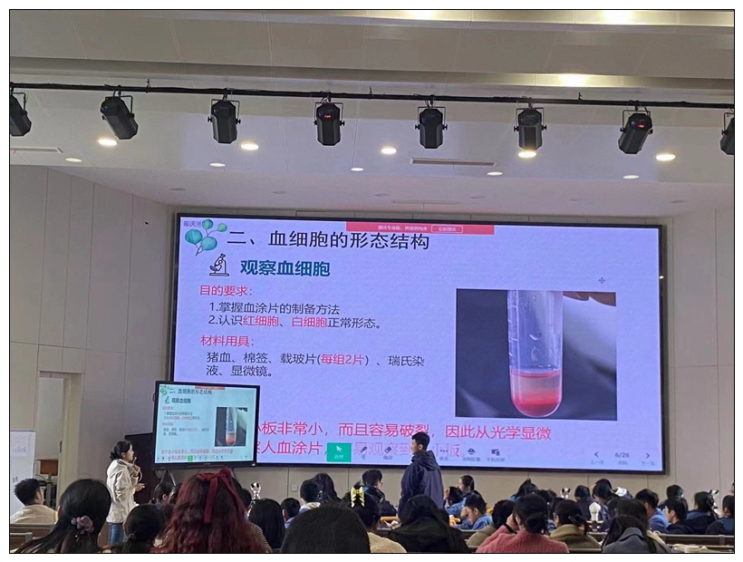 首先是由章欣老師執(zhí)教的七年級第十章第一節(jié)《血液與血型》。章老師聯(lián)系生活,從“手指割破”入手引出課題。然后通過兩個實驗任務“觀察血液分層”和“制作血涂片”突破重難點。然后再通過通過“解讀血常規(guī)化驗單”活動任務完成對學生深度學習的評價。