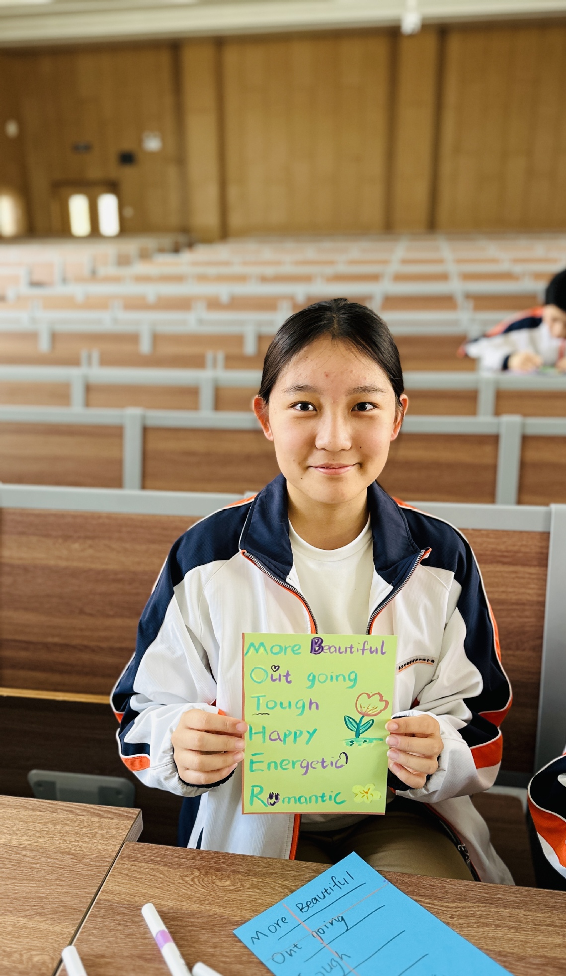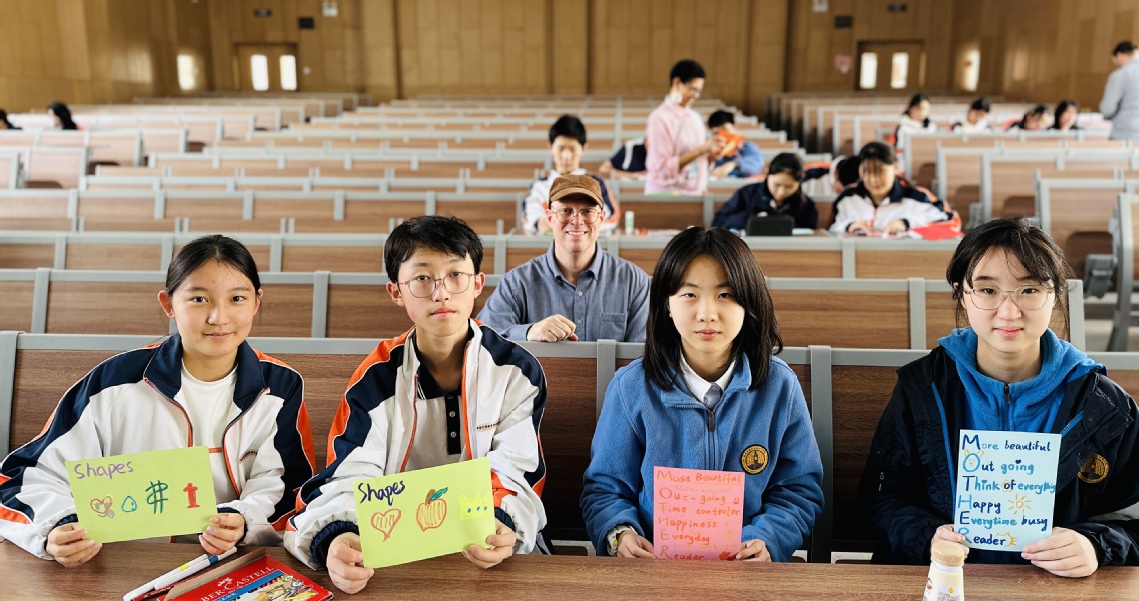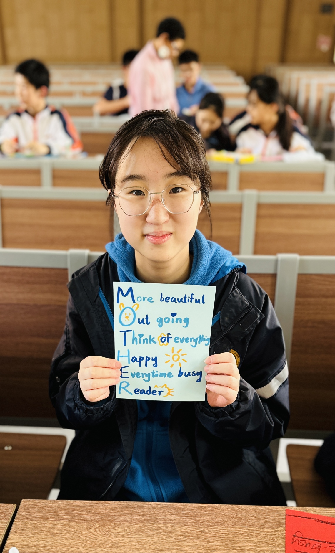 在活動現(xiàn)場,外教們將同學們分成不同的小組,每位外教指導一個小組并精心準備了彩色卡紙和各種工具方便制作獻給母親的賀卡。在制作之前,外教們引導學生們思考:“What does your mother do for you?”(母親為你付出過什么?)和“What are your mother’s expectations of you?”(母親對你的期待是什么?)通過這些問題,學生們不僅更加珍惜母親的付出,也明白了作為新時代的青年,應該努力學習,回報母親。在賀卡制作環(huán)節(jié),每個小組的主題都不一樣。有的小組是創(chuàng)作了英語藏頭詩,詩歌的每一句開頭字母組合起來就是“Mother”(母親)。也有的小組是利用拼貼的方式制作,還有的手巧的同學們制作了立體的賀卡,繪制了母親的頭像等等。一句句深情的祝福包含著同學們的創(chuàng)意和心意,也是對母親最溫暖的告白。