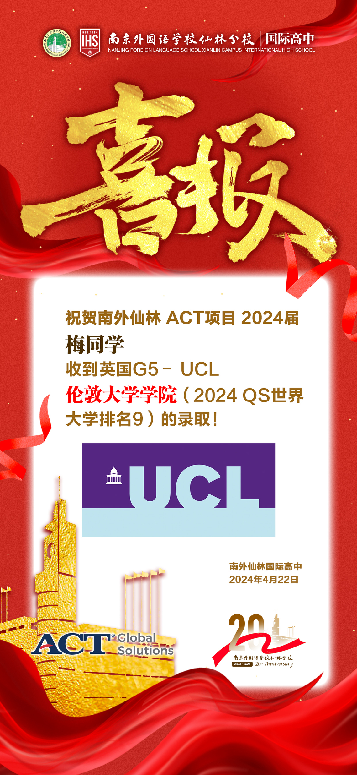 offer季 || 祝賀2024屆ACT項(xiàng)目梅詩(shī)涵同學(xué)獲得英國(guó)G5 倫敦大學(xué)學(xué)院(UCL)錄取!