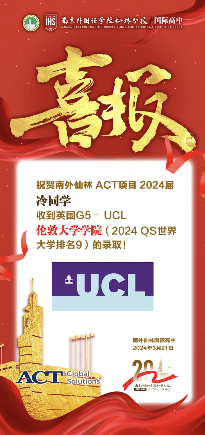 offer季 || 祝賀2024屆ACT項(xiàng)目冷同學(xué)獲得英國(guó)G5 倫敦大學(xué)學(xué)院(UCL)錄?。?024QS世界大學(xué)排名第九??!