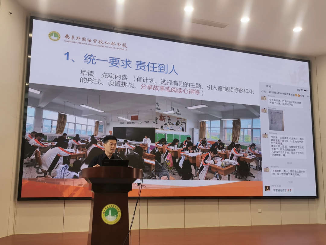 中澳項目12年級的楊海東老師分享了12年級組的教學管理的做法和心得。為營造一個有利于學生學習和成長的優(yōu)良環(huán)境,采取了一系列精細化的管理措施。開學伊始的目標管理要求每一個學生要明確自己的目標,規(guī)劃學習路徑,并在整個學期中保持學習的動力和效率。在教學管理過程中做到有具體任務(wù)、有監(jiān)督進度、有分層教學、有合理評估、有獎懲幫扶。在早中晚三個自習時段的管理上,學生自我管理和值班教師督管相結(jié)合,要求:“早有內(nèi)容,午休安靜,晚有收獲”的思路,采取了一系列措施,營造有序、高效、自覺的學習環(huán)境。