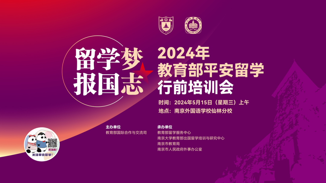 5月15日上午,“留學(xué)夢(mèng) 報(bào)國(guó)志——2024年教育部平安留學(xué)行前培訓(xùn)會(huì)”在我校小劇場(chǎng)隆重舉行。本次活動(dòng)由教育部國(guó)際合作與交流司主辦,教育部留學(xué)服務(wù)中心、南京大學(xué)教育部出國(guó)留學(xué)培訓(xùn)與研究中心、南京市教育局和南京市人民政府外事辦公室共同承辦。