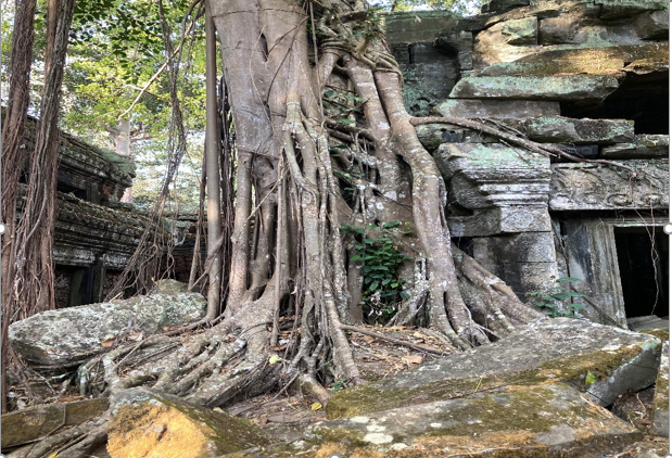 Next on my list was the very Lara Croft “The Tomb Raider” movie location at Ta Prohm temple. The original name for this temple was “Rajavihara” translated to the “Royal Monastery” and was “Mahayana Budhist monastery and learning center dedicated to the Kings mother. This temple was built without mortar and after it was abandoned the trees took root in the loosened stone crevices. The trees growing out of the ruins and the jungle is such a powerful sight of the amazing power of nature and an incredible sight to behold up close. The modern day, painfully slow and detailed restoration of the temple supports nature and the temple itself. The sight of these immense temple building and trees was a truly humbling site. There are so many nooks, crannies and walkways, one could easily spend an entire day there.