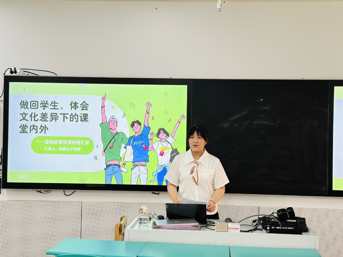 會(huì)議開始龔熙華主任介紹了會(huì)議的主要流程。首先由中學(xué)部于碧若老師和孫靜老師作為代表向各位同仁匯報(bào)了暑期前往美國(guó)威斯康星大學(xué)進(jìn)行為期兩周的教師培訓(xùn)的感悟和收獲。于碧若老師從美國(guó)價(jià)值觀的多樣性入手,介紹了美國(guó)教育的基本情況,其中包括美國(guó)的課程設(shè)置和美國(guó)師生的生活方式等方面。孫靜老師則是介紹了一些培訓(xùn)中的具體課堂活動(dòng)的操作過(guò)程。在這次的培訓(xùn)中,18位來(lái)自各個(gè)學(xué)部的英語(yǔ)老師自己又做回學(xué)生,有了更加深入的體驗(yàn)。在今后的教學(xué)中我們也希望能夠運(yùn)用所學(xué)的知識(shí)和技能,為我們的學(xué)生拓展英語(yǔ)學(xué)習(xí)的廣度和深度,使他們有能力用英語(yǔ)向世界傳遞中國(guó)文化。