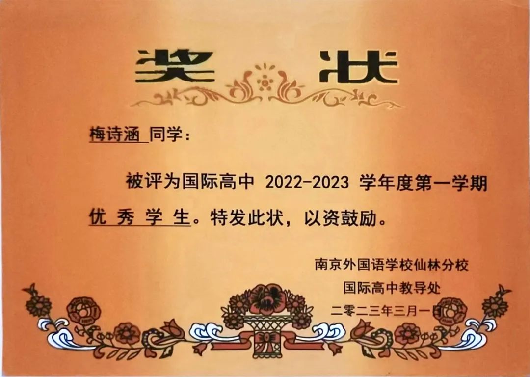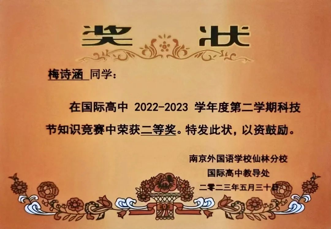 在南外仙林的第一學(xué)年,梅同學(xué)被評為南外仙林校優(yōu)秀學(xué)生、獲得??萍贾R競賽二等獎等榮譽(yù)。