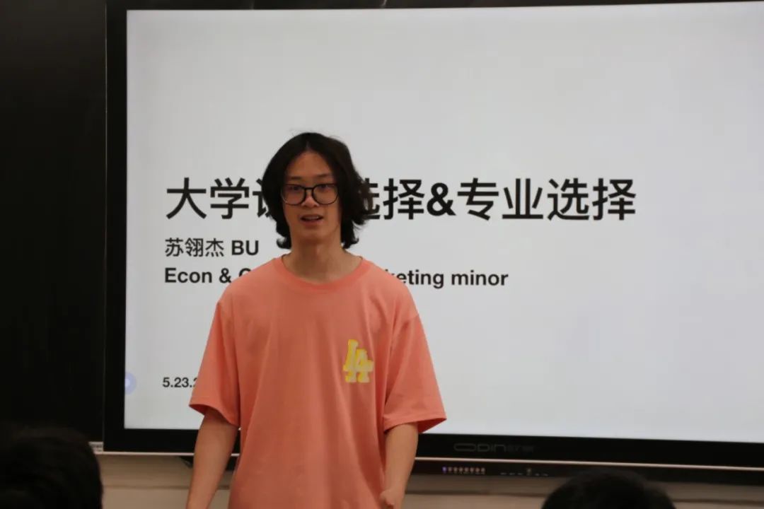 現(xiàn)就讀于波士頓大學(xué),雙專業(yè)為經(jīng)濟(jì)與計(jì)算機(jī)科學(xué),輔修市場營銷,他的分享主題是大學(xué)課程選擇和專業(yè)選擇。他詳細(xì)講解了如何平衡不同課程和專業(yè)的學(xué)習(xí),鼓勵大家多嘗試,找到最適合自己的方向。