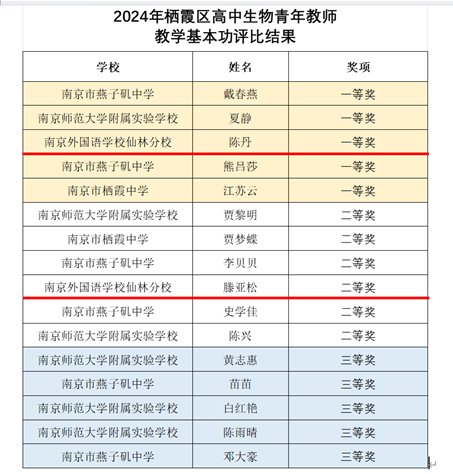 我校高中生物組陳丹和滕亞松兩位教師在2024年棲霞區(qū)高中生物學(xué)青年教師基本功比賽中分別獲得一等獎(jiǎng)和二等獎(jiǎng)。