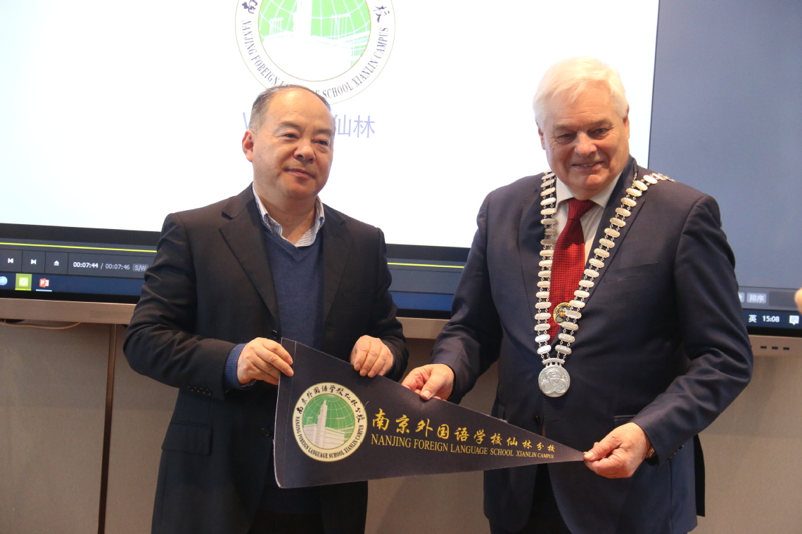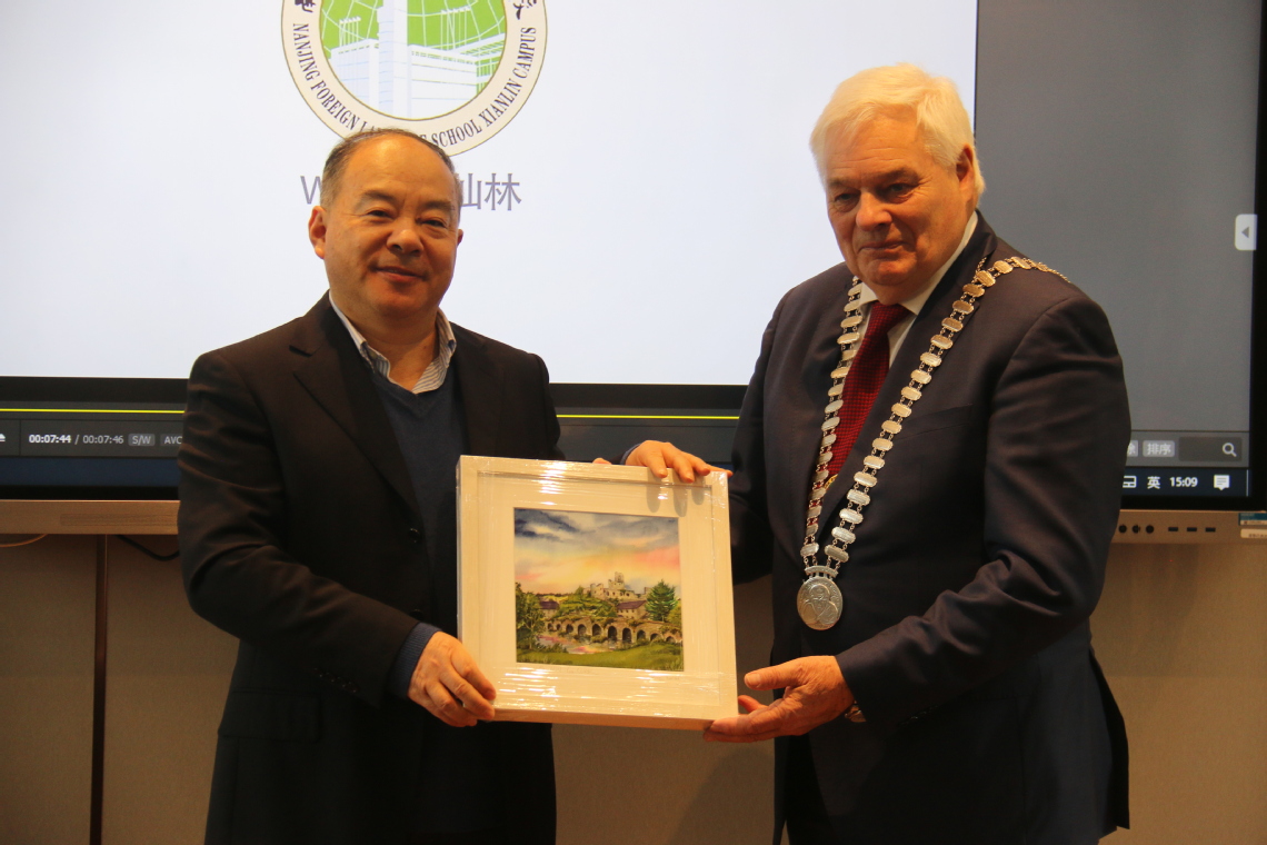 交流會后,訪問團一行及市領(lǐng)導(dǎo)與南外仙林分校鄒正校長進行了會談并觀看了學(xué)校宣傳片,清晰直觀的了解學(xué)校校本課程特色及豐富多彩的課外活動。來自愛爾蘭的各位嘉賓在聽取鄒校長介紹了我校全面發(fā)展、自由成長的教育理念后表示收獲頗豐。鄒校長也提出學(xué)校將積極開展多元合作模式,進一步拓展與愛爾蘭科克郡在師生訪學(xué)研修、國際教育等方面的合作。會談最后,鄒校長向奧弗林郡長贈送了南京特色的云錦畫卷,郡長也回贈了科克郡的油畫,共祝兩地友誼深厚綿長。