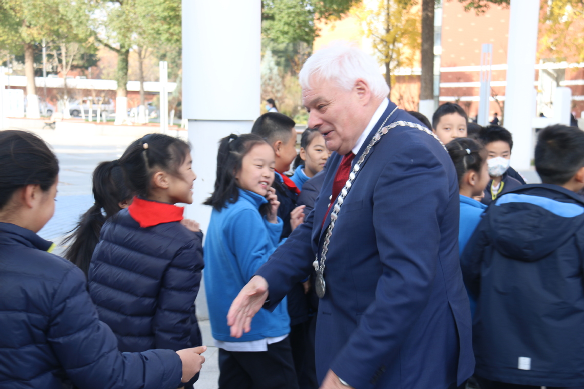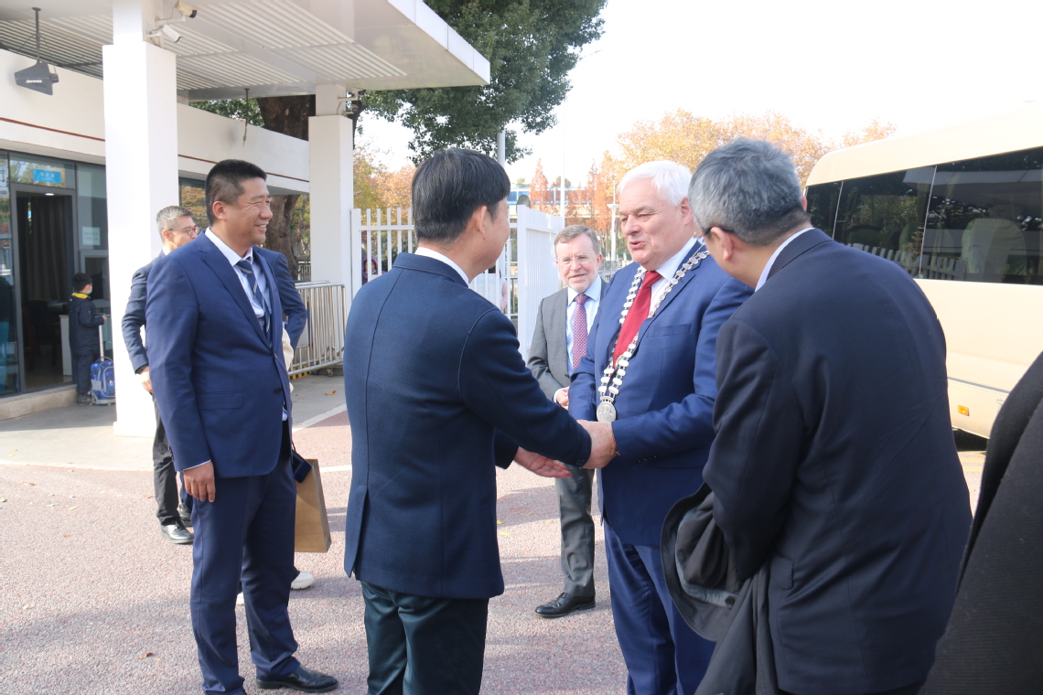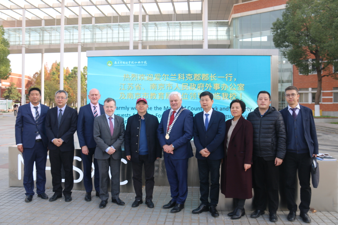 作為2022年第四屆“三葉草杯”中學(xué)生英語演講比賽的特等獎獲得者,我校師生四人獲得愛爾蘭科克郡政府的全額資助,于2023年10月飛赴愛爾蘭進行為期一周的游學(xué)訪問。在那里,他們受到了來自愛爾蘭科克郡郡長奧弗林先生的熱情招待。本屆決賽,我校有幸邀請愛爾蘭科克郡郡長奧弗林先生一行5人回訪我校,并擔(dān)任決賽評委及頒獎嘉賓。南京市教育局盧普新局長、戰(zhàn)全慶處長、王小民處長、南京市人民政府外事辦公室夏炎主任、我校程彩玲校長以及“三葉草”杯參賽的4名師生和我校外事辦的老師們熱情接待了來訪團。