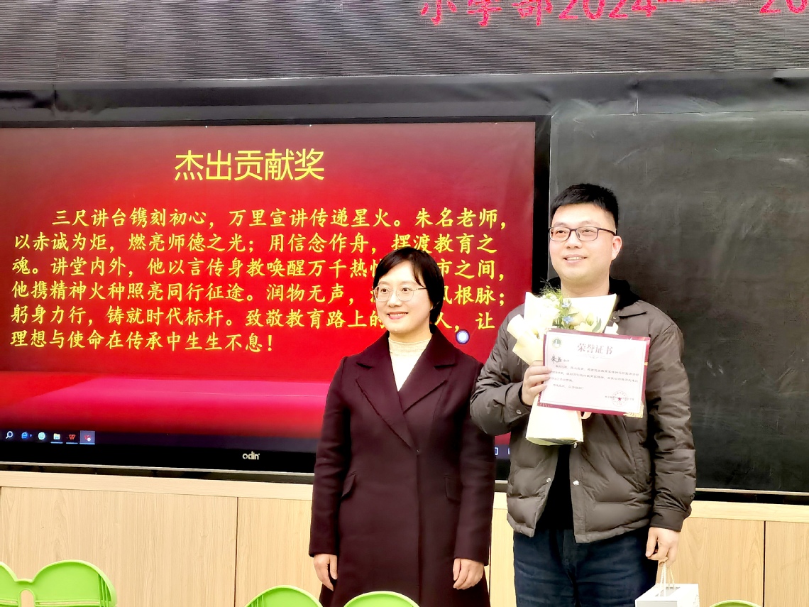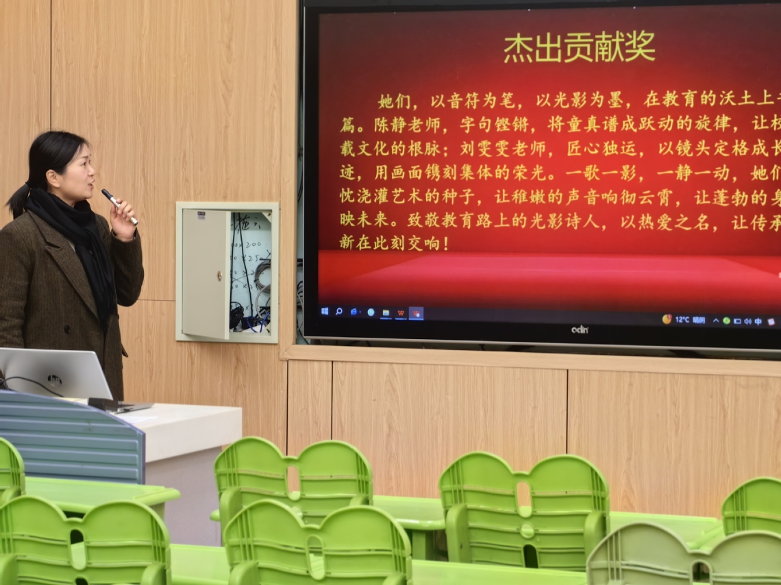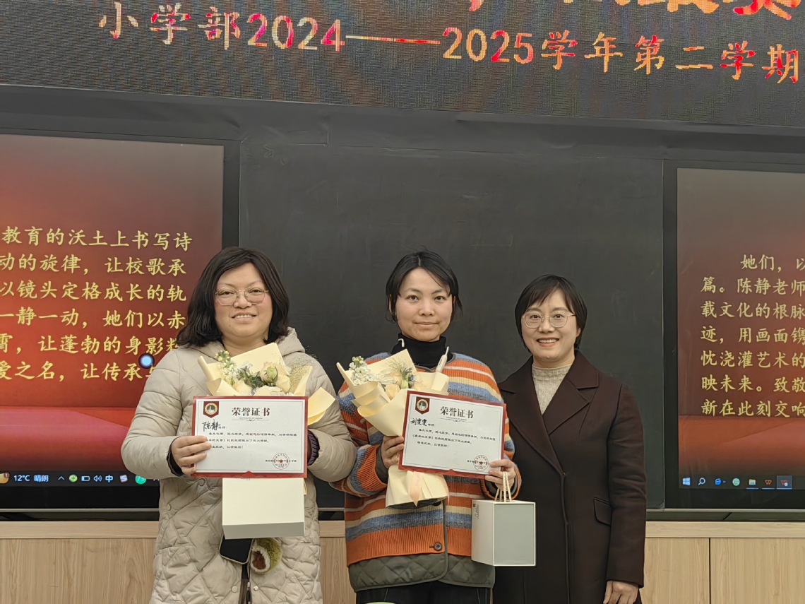 會議的第二項議程是頒發(fā)杰出貢獻獎。大隊輔導員徐榮花老師為陳靜、劉雯雯老師宣讀頒獎詞:“她們,以音符為筆,以光影為墨,在教育的沃土上書寫詩篇。陳靜老師,字句鏗鏘,將童真譜成躍動的旋律,讓校歌承載文化的根脈;劉雯雯老師,匠心獨運,以鏡頭定格成長的軌跡,用畫面鐫刻集體的榮光。一歌一影,一靜一動,她們以赤忱澆灌藝術的種子,讓稚嫩的聲音響徹云霄,讓蓬勃的身影輝映未來。致敬教育路上的光影詩人,以熱愛之名,讓傳承與創(chuàng)新在此刻交響!”