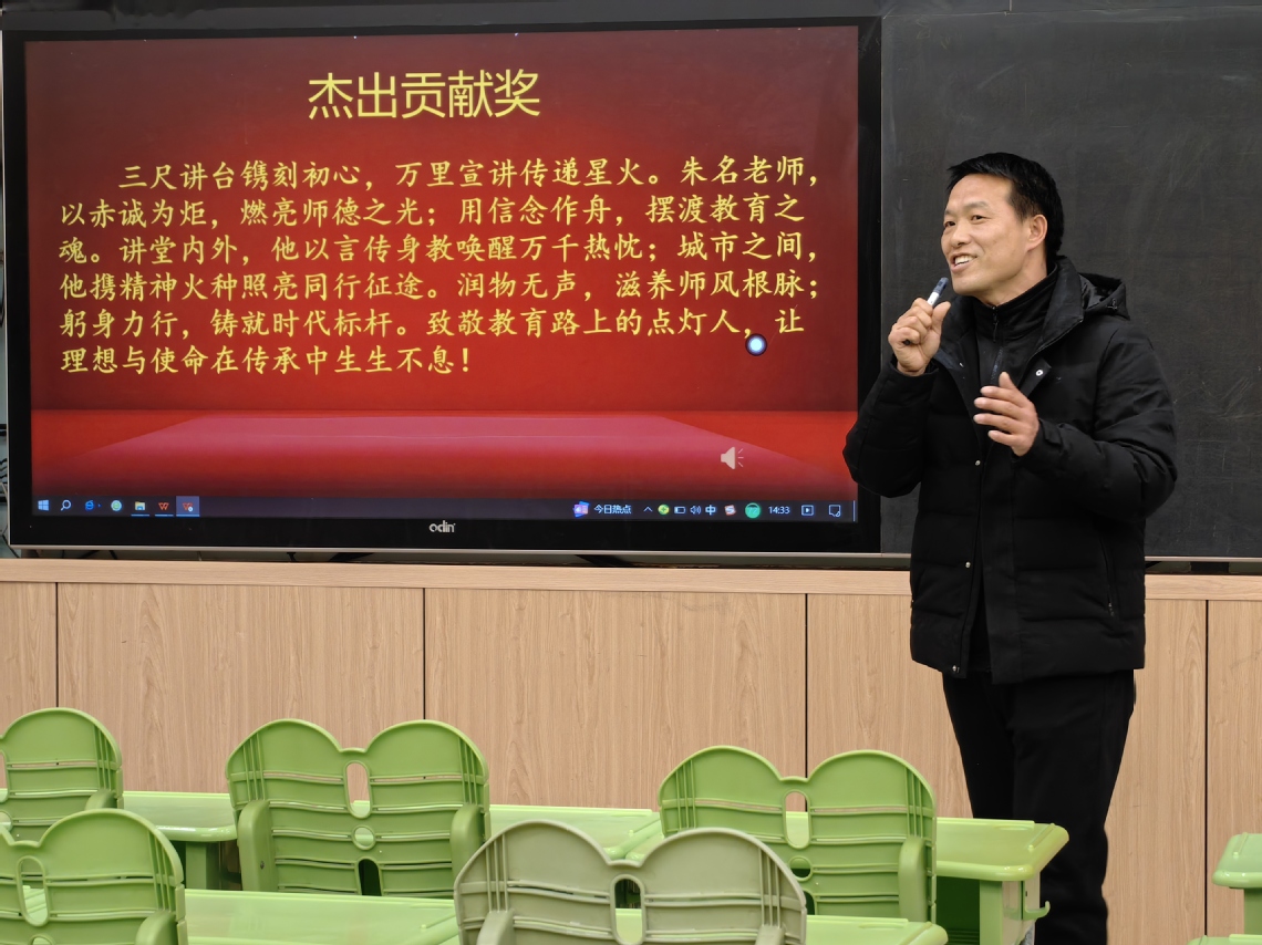 羅學潮老師為朱名老師宣讀頒獎詞:“三尺講臺鐫刻初心,萬里宣講傳遞星火。朱名老師,以赤誠為炬,燃亮師德之光;用信念作舟,擺渡教育之魂。講堂內(nèi)外,他以言傳身教喚醒萬千熱忱;城市之間,他攜精神火種照亮同行征途。潤物無聲,滋養(yǎng)師風根脈;躬身力行,鑄就時代標桿。致敬教育路上的點燈人,讓理想與使命在傳承中生生不息!”