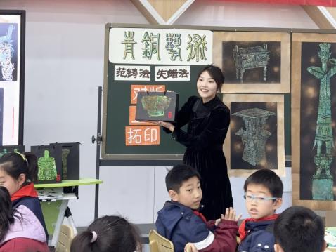 王玉晶老師執(zhí)教五年級下冊《青銅藝術(shù)》一課。王老師將這一課進行大單元設(shè)計,置身于“像藝術(shù)家一樣創(chuàng)作”的過程。王老師在第一課時已讓學(xué)生了解青銅器的種類、造型、色彩、紋飾等,并完成粉印紙版畫的畫稿和刻版步驟,本節(jié)課以“復(fù)刻青銅藝術(shù),創(chuàng)國潮文創(chuàng)”為主線,通過“文化感知、技法實踐、創(chuàng)意應(yīng)用”三步展開,王老師以結(jié)界獸的視頻導(dǎo)入,激發(fā)學(xué)生學(xué)習(xí)興趣,繼而通過溫故知新的環(huán)節(jié)帶領(lǐng)學(xué)生回顧第一課時的知識點,結(jié)合視頻讓學(xué)生了解范鑄法與失蠟法,幫助學(xué)生進一步了解青銅藝術(shù)特質(zhì)與文化內(nèi)涵。王老師以粉印紙版畫拓印青銅器的形式呈現(xiàn)作品,讓學(xué)生感受青銅藝術(shù)的造型美、紋樣美、色彩美。體驗到博物館中的青銅器也可以滲透進生活中,青銅文化無處不在。