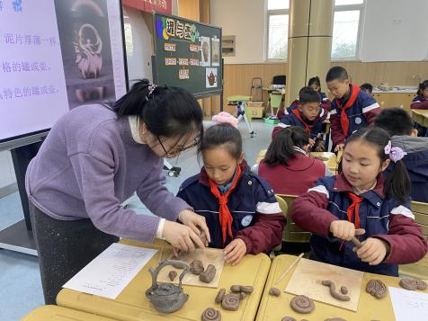 在葛含之老師執(zhí)教的《罐與壺》特色陶藝課中,學(xué)生們化身"小小考古學(xué)家",通過動態(tài)復(fù)原的彩陶殘片開啟探秘之旅。在對比觀察新石器雙耳罐與元代青花罐時,解析造型、紋飾與功能的關(guān)聯(lián),觸摸中華造物智慧。教師精準示范泥條盤筑技法,重點演示泥片銜接與器型把控要領(lǐng)。實踐環(huán)節(jié),陶泥在指尖流轉(zhuǎn)成型:或塑成帶浮雕紋的陶罐,或設(shè)計既有傳統(tǒng)韻味又充滿個性的創(chuàng)意紫砂壺。在展示與評價環(huán)節(jié),學(xué)生們滿懷自豪地展示自己的作品。同學(xué)們在交流中相互學(xué)習(xí),教師的總結(jié)評價則為學(xué)生們指明了努力的方向。最后,在知識回顧與拓展環(huán)節(jié),學(xué)生們對陶藝有了更深層次的認識。他們不僅了解了陶藝的歷史文化內(nèi)涵,還體會到了傳統(tǒng)藝術(shù)在現(xiàn)代生活中的價值。這堂課以"器"載道,通過"觀察-解構(gòu)-重構(gòu)"的學(xué)習(xí)閉環(huán),讓陶藝不僅是泥與火的交融,更成為文化基因的當(dāng)代萌發(fā)。孩子們在塑形造物間,既習(xí)得傳統(tǒng)技藝精髓,更培育出"設(shè)計思維"與"工匠精神"的萌芽。