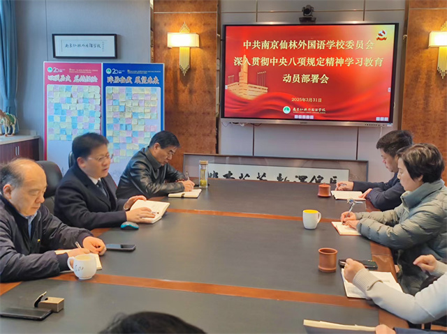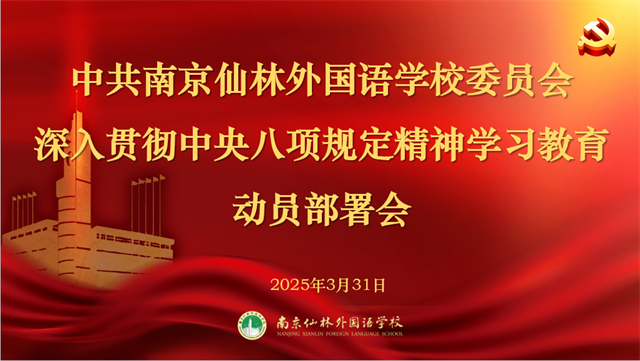 3月31日,中共南京仙林外國語學(xué)校委員會召開深入貫徹中央八項規(guī)定精神學(xué)習(xí)教育動員部署會。校黨委班子成員及領(lǐng)導(dǎo)班子全體成員參會,旨在強化學(xué)校領(lǐng)導(dǎo)干部的紀(jì)律意識,推進全面從嚴(yán)治黨在校園落地生根。