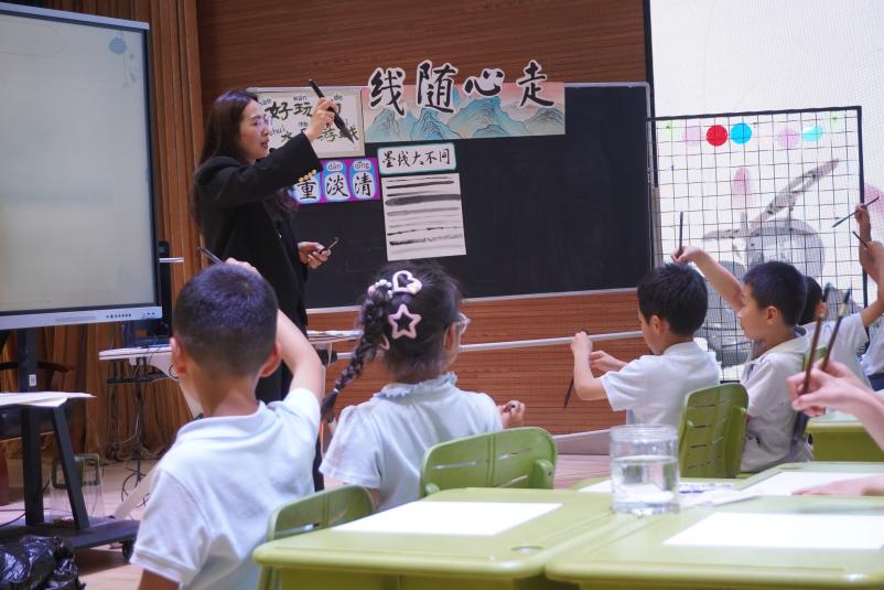 隨后,陳春萌老師的《線隨心走》一課承前啟后,以音樂融入教學(xué)之中,伴隨著樂聲的高低起伏,“線的散步”游戲與練習(xí)拉開了學(xué)生們學(xué)習(xí)的帷幕。陳老師引領(lǐng)學(xué)生在玩中學(xué)、學(xué)中悟,引導(dǎo)學(xué)生將內(nèi)心的情感起伏融入水墨線條的表達(dá)之中,再通過一系列的名作賞析,鼓勵孩子們積極探索和大膽創(chuàng)造,以實(shí)現(xiàn)“心手相應(yīng)”的創(chuàng)作境界。