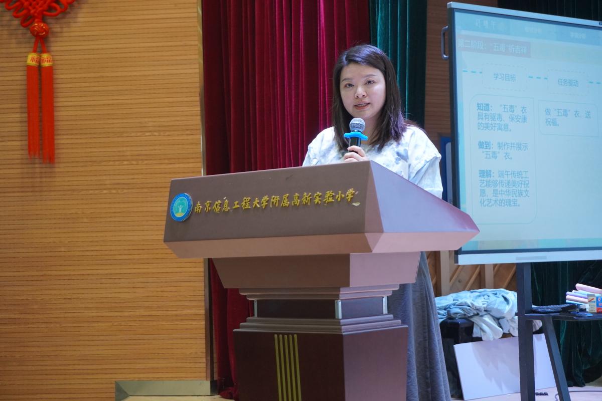 第一單元《過端午》由南京信息工程大學(xué)附屬高新實(shí)驗(yàn)小學(xué)的劉燁、韓曉萌兩位老師共同呈現(xiàn)。劉燁老師率先以《過端午》單元說課揭開序幕。她從新課標(biāo)理念出發(fā),以“問題驅(qū)動”串聯(lián)端午文化的探究脈絡(luò),構(gòu)建了“識民俗、探寓意、創(chuàng)表達(dá)”的教學(xué)框架。