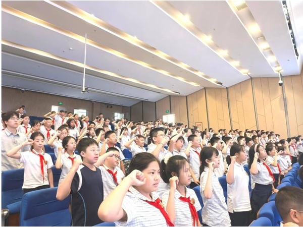 大會最后,進入莊嚴的宣誓環(huán)節(jié)。全體六年級同學高舉右拳,目光堅定,彰顯著學子們的決心與斗志。