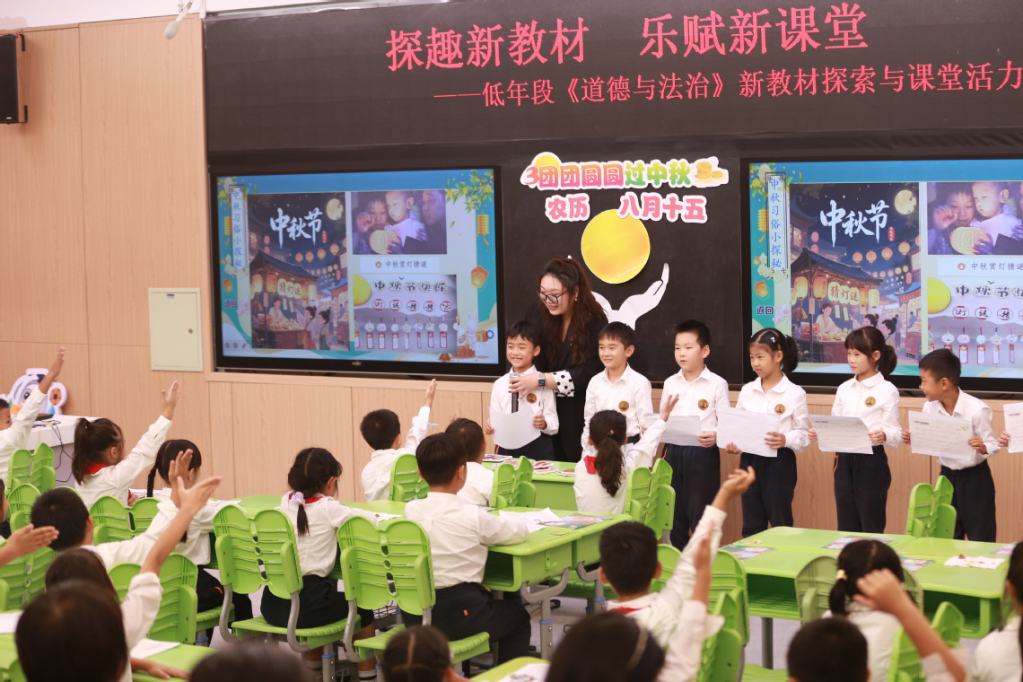 為深入貫徹落實新課標(biāo)理念,推動《道德與法治》新教材在低年段課堂中的有效實施,昨天下午,我校小學(xué)部丁潔老師開設(shè)了一節(jié)題為《團團圓圓過中秋》的研討課。張蕾芬副校長、任志剛副校長、魏環(huán)君主任以及低段所有班主任全程參加了本次活動。本次活動由德育備課組長王曄老師主持。